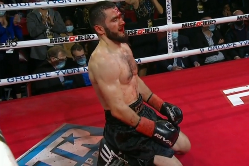 Руснакът беше с изцяло кърваво лице, след неволен сблъсък на главите на двамата боксьори в четвъртия рунд. Това обаче не попречи на Бетербиев да запази отличната си статистика от 17 победи със 17 нокаута.