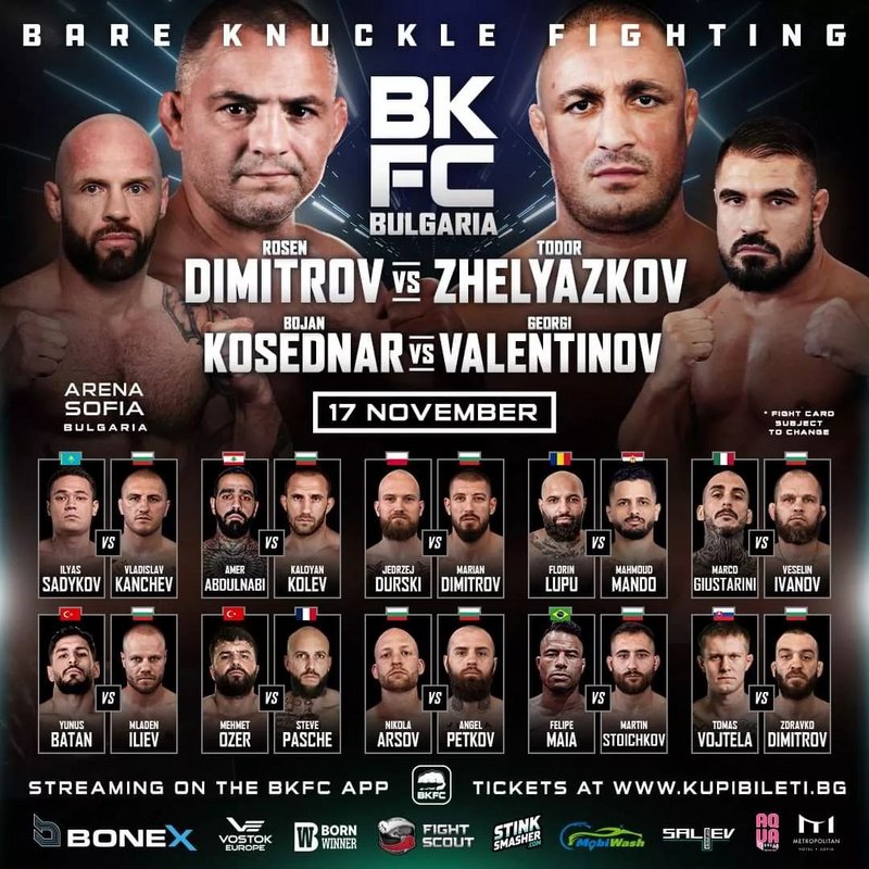 Битките започват в 20:00 часа този петък (17 ноември) в столичната зала "Арена София". Състезанието ще се излъчва и на живо по телевизионния канал Диема, както и в над 90 държави по PPV през мобилното приложение на BKFC.