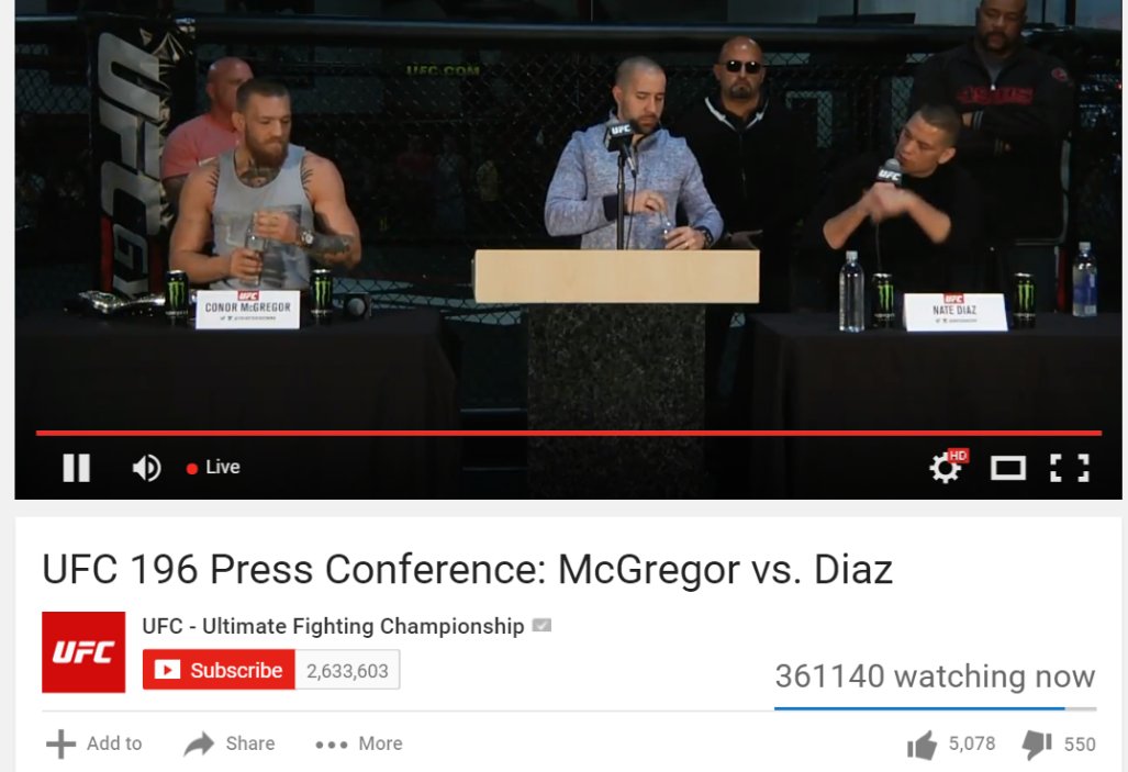 Публичната медийна поява на McGregor и Diaz преди UFC 196 бе гледана от 360 000 зрители. Пресконференцията преди UFC 200 стигна едва 33 000.