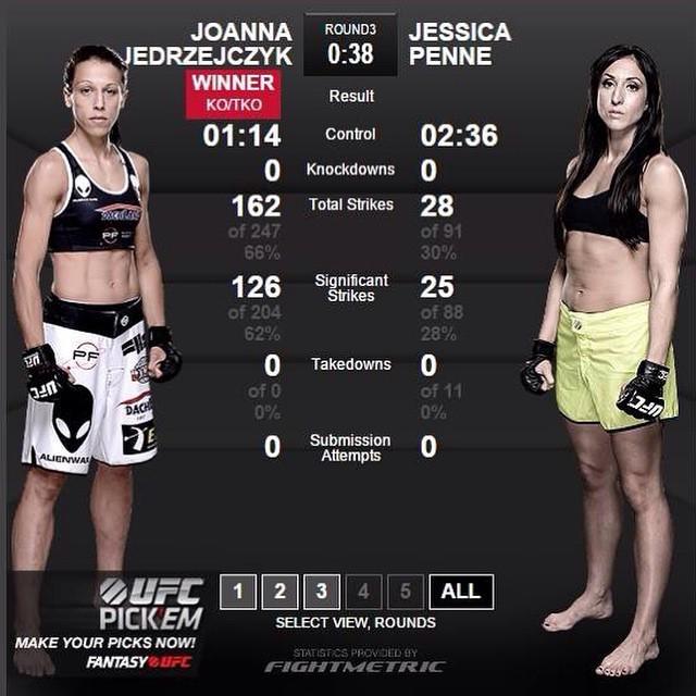 Joanna Jedrzejczyk буквално прегази Jessica Penne през изминалия уикенд в UFC Fight Night 69 при първата си защита на титлата в категория сламка. Също както при срещата с Carla Esparza, Jedrzejczyk и сега успя да пробие гарда на Penne и да нанесе силни и точни удари. Още след първата канонада, лицето на Penne беше пострадало.
