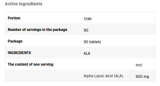 Има антиоксидантни свойства Инхибира развитието на атеросклеротични лезии Подкрепя работата на сърцето Подобрява ефективността Регулира гликемията Предпазва очите и черния дроб Притежава инсулиноподобни свойства Улеснява проникването на аминокиселини и креатин в мускулните клетки Алфа-липоевата киселина също служи като помощно средство за отслабване. Всичко това благодарение на факта, че подобрява метаболизма на липидите и въглехидратите и нормализира нивото на кръвната захар, превръщайки глюкозата в неутрален гликоген, натрупващ се в черния дроб. Начин на употреба: Премайте 1 таблетка дневно.