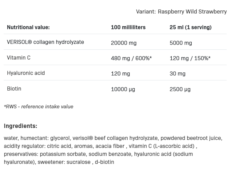 За да отговорим на очакванията на нашите клиенти, подготвихме нашия водещ продукт COLLAROSE ELIXIR в нова концентрирана форма. Всяка бутилка от 500ml съдържа до 20 дози, които трябва да се разтворят в 150 ml вода. Това създава напитка с приятен вкус на малина и ягода. КАКВО Е РАЗЛИЧНОТО В Collarose Elixir? ФОРМУЛА, СЪЗДАДЕНА ЗА КРАСОТА Колагените от линията COLLAROSE са базирани на колаген под формата на биоактивни колагенови пептиди VERISOL®, произведени от немската фармацевтична компания GELITA, чиято ефикасност е допълнително подсилена с активни съставки: витамин С, биотин и хиалуронова киселина. Действието на добавката се основава на принципа на синергията на няколко съставки, което значително повишава ефективността на продукта. Благодарение на това добавката COLLAROSE може да бъде полезна не само за инхибиране на стареенето на кожата, но и за защитата й от UV лъчи и физическо увреждане. Витамин С подпомага правилния синтез на колаген, който е основният компонент на дермата и има антиоксидантни свойства. Хиалуроновата киселина помага за поддържане на подвижността и правилното състояние на ставите, като същевременно спомага за поддържане на правилната структура и еластичност на кожата. Биотинът е съставка, която помага за поддържане на здравословното състояние на кожата и косата, като същевременно укрепва имунитета и здравината на ноктите. ЗА КОГО Е ЕЛИКСИРЪТ COLLAROSE? COLLAROSE ELIXIR е идеална добавка за жени, чиято кожа е изложена на прекомерна слънчева светлина, хора, които прекарват много време пред екрана на компютъра или телефона и всички, чиято диета не осигурява всички необходими съставки, необходими за поддържане на здрави и млади. изглеждаща кожа. Препаратът е особено препоръчителен за жени, които държат на красивия си външен вид, искат да забавят процеса на стареене на кожата и да подобрят нейната стегнатост, цвят и еластичност. С КАКВО COLLAROSE ELIXIR СЕ РАЗЛИЧА ОТ ДРУГИТЕ ВЕРСИИ COLLAROSE? Действието и ефективността на всички продукти са абсолютно еднакви, тъй като дозите на всички активни съставки, т.е. колагенови пептиди, витамин С, биотин, хиалуронова киселина в една порция в продуктите са идентични. COLLAROSE се различават само по формата на приложение. Затова изберете перфектната форма за себе си! ? VERISOL® е регистрирана търговска марка на Gelita AG. Начин на употреба: Разтворете 1 порция (25ml - 3 супени лъжици) в 150ml вода. Разклатете преди употреба. Не превишавайте 1 порция на ден.