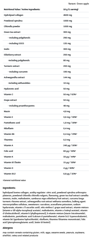 Тази формула подпомага здрава кожа, коса и нокти чрез колагена и витамин C, който спомага за нормалната синтеза на колаген, както и защитава клетките от оксидативен стрес с мощни антиоксиданти от растителен произход. Добавените витамини и адаптогени допринасят за повишаване на жизнеността, намаляване на умората и поддържане на имунната функция при активен начин на живот. Спирулина и хлорела осигуряват допълнителни хранителни вещества, а инулинът допринася за храносмилателното здраве като пребиотик. Продуктът е с приятен вкус на зелено ябълко и е предназначен за ежедневна употреба като част от балансиран режим за поддържане на общото здраве и жизненост. Начин на употреба: Разтворете 10 g (1 мерителна лъжица) в 200–250 ml вода и приемайте веднъж дневно след приготвяне, без да приемате на празен стомах.