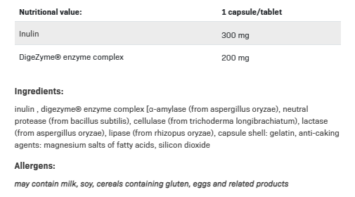 Как помагат храносмилателните ензими? ALLNUTRITION ХРАНИТЕЛНИ ЕНЗИМИ съдържа патентования ензимен комплекс DigeZyme®, който се състои от пет храносмилателни ензима като: амилаза, целулаза, липаза, лактаза и протеаза. Храносмилателните ензими помагат за разграждането на макромолекулите на по-малки елементи, което прави хранителните съставки още по-добре усвоени. Това ви позволява да сведете до минимум или дори да премахнете храносмилателните проблеми. Активни съставки ALLNUTRITION ХРАНОСМИЛАТЕЛНИ ЕНЗИМИ Амилазата е ензим, който помага за смилането на полизахаридите, като ги разгражда до прости захари, така че след това да се абсорбират от храносмилателния тракт в тази опростена форма. Ензимът се произвежда главно от слюнчените жлези и панкреаса. Протеазата е ензим, отговорен за разграждането на протеините в нашето тяло. Той разгражда растителните и животинските протеини до по-прости форми, т.е. пептиди и аминокиселини. Лактазата е ензим, необходим, наред с други, за смилането на мляко и продукти, съдържащи или получени от него. Ензимът действа, като разгражда лактозата, т.е. млечната захар, на глюкоза и галактоза, благодарение на което тялото ни може да използва тези захари като източник на енергия. Липазата е ензим, отговорен за разграждането на мазнините по време на храносмилането. Преобразува триглицеридите в мастни киселини и глицерол. Целулазата е ензим, отговорен за разграждането на целулозата в процеса на храносмилане. Начин на употреба: Приемайте по по 1 капсула два пъти дневно (за предпочитане по време на хранене) с вода.