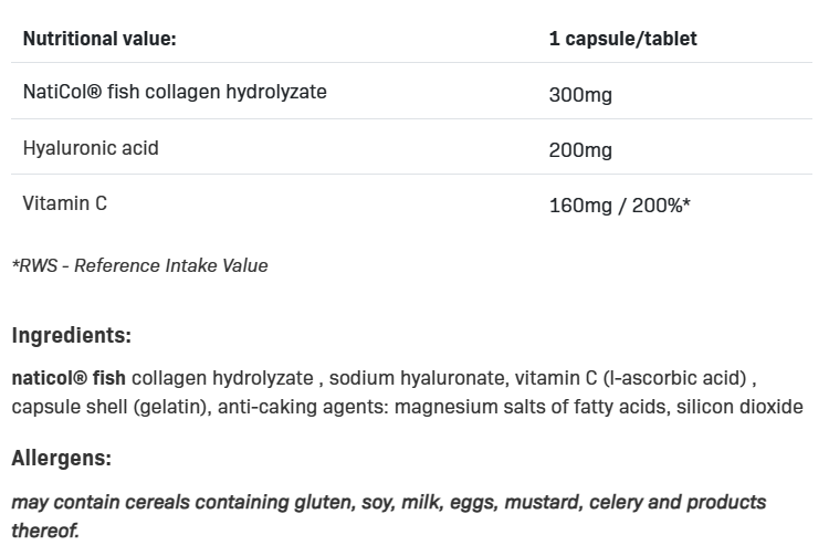 AllNutrition Hyaluronic Acid Forte е мощна добавка с висока концентрация на хиалуронова киселина, предназначена да осигури дълбока хидратация и подмладяване на кожата. Хиалуроновата киселина е естествен компонент на кожата, който запазва влагата и стимулира производството на колаген и еластин, като по този начин подобрява еластичността и тонуса на кожата. Тази добавка не само намалява видимостта на бръчките, но също така подпомага здравето на ставите и свързващите тъкани, като ги поддържа гъвкави и здрави. Идеална за хора, които искат да поддържат млада и здрава кожа, както и за тези, които се грижат за мобилността и комфорта на ставите. AllNutrition Hyaluronic Acid Forte е вашият избор за по-свеж и жизнен вид! Начин на употреба: Приемайте по 1 капсула с вода.