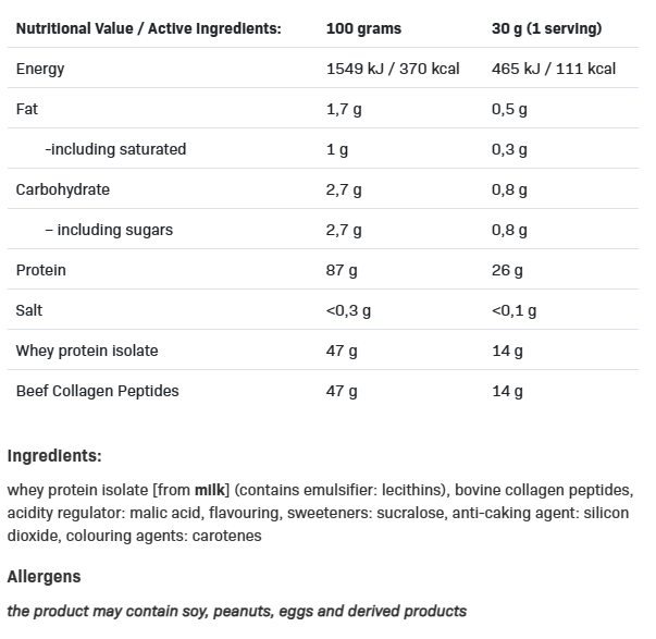 Продуктът предлага до 26 g протеин на една порция, което подпомага растежа и поддържането на мускулната маса, както и предоставя пълен аминокиселинен профил . Добавеният колаген не само допринася към общия протеинов прием, но може да подпомогне здравето на ставите и съединителната тъкан, като допълва ползите от изолата . Формулата е без добавена захар и мазнини, а освежаващите плодовите вкусове правят продукта подходящ избор както за след тренировка, така и за всеки момент, когато е нужно допълнително количество белтък и леко приемане. (текст пред базиран на описания от Allnutrition във вариращи европейски магазини) Начин на употреба: Разтворете 30 g (приблизително 1,5 мерителни лъжички) в 250–300 ml вода и консумирайте веднага след тренировка или когато желаете допълнителен протеин.