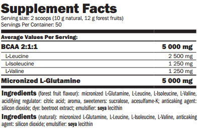Съставки: Микронизиран L-глутамин, L-левцин, L-изолевцин, L-валин, противоспичащи агенти: магнезиев стеарат, силициев диоксид.