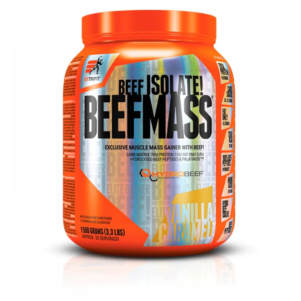 Маркираният протеинов изолат HydroBEEF (хидролизирани пептиди от говеждо месо) с 97% съдържание на протеини от говеждо месо е основа на нашия гейнер BeefMass. Добавихме висококачествена карбонова матрица за максимален растеж на мускулната маса и увеличаване на издръжливоста. BeefMass е нов гейнер, съдържащ хидролизиран изолат на говеждо месо с почти нулево съдържание на мазнини и захар. Протеиновият изолат HydroBEEF® е един от най-добрите протеинови източници. Приемът на протеини от говеждо месо при силовите атлети е с дълга традиция. BeefMass е предназначен за всеки, който иска да увеличи мускулната маса, силата и резултатите си в залата.