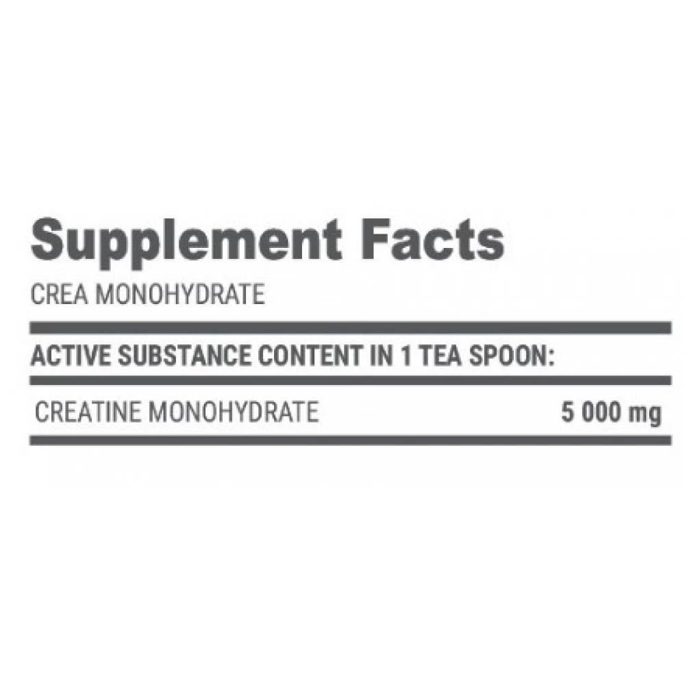 Creatine Monohydrate съдържа креатин под формата на микронизиран креатин монохидрат. Креатинът повишава физическата активност в последователни изблици на краткосрочни тренировки с висока интензивност, както обикновено протичат тренировките на бодибилдъри или хора занимаващи се с фитнес на професионално ниво. Този ефект се постига с дневен прием на 3 гр креатин.