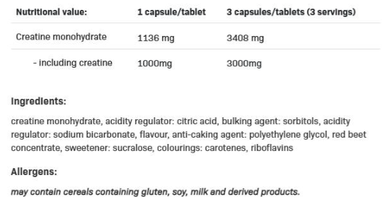 Без добавена захар, този продукт поддържа енергията и мускулната сила по време на кратки, интензивни натоварвания. Ефирната форма позволява бързо разтваряне във вода и лесна употреба, докато научно доказаните ползи от креатина гарантират по-ефективно представяне и по-добро възстановяване. Начин на употреба: Разтворете 1 таблетка в 200 ml вода и изпийте веднага, до 3 таблетки дневно.