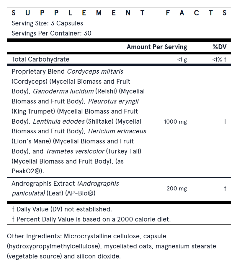 Подкрепете ежедневната жизненост на тялото си. Jarrow Formulas® Immune Optimizer™ включва здравословна гъбена смес от Кордицепс, Рейши, Лъвска грива, Шийтаке, Ветрогонова гъба и Пуешка опашка, за да помогне за защита срещу свободните радикали. В комбинация с AP-BIO® Andrographis paniculata, адаптогенен ботанически продукт, клинично изследван за поддържане на здравето на имунната система. ПОДКРЕПА НА ИМУНИТЕТА: Подкрепете здравето си с 6 мощни гъби, комбинирани с AP-BIO® Andrographis paniculata за подкрепа на имунната система. КЛЕТЪЧНА ПОДКРЕПА: Помага за защита срещу свободните радикали; L-ерготионеинът е антиоксидант, за който е установено, че има собствен механизъм за клетъчен транспорт. AP-BIO® 200mg Andrographis paniculata поддържа имунната система и притежава адаптогенни свойства. AP-BIO®, който включва 7 биоактивни вещества, е клинично изследван и поддържан за здравето на имунната система. Бета-глюканите са основното полезно съединение в гъбите, което помага за поддържане на нашата имунна защита чрез засилване на имунния отговор, повишаване на функцията на системата и вродените имунни клетки. Веган Без глутен Без ГМО Начин на употреба: Приемайте по 3 капсули веднъж дневно или според указанията на вашия квалифициран медицински специалист.