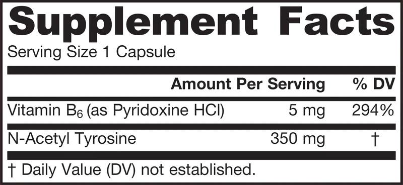 N-ацетил тирозин подпомага мозъчната функция, като подпомага синтеза на катехоламините норепинефрин и допамин (невротрансмитери). Витамин B 6 е от съществено значение за метаболизма на аминокиселините. Начин на употреба: Приемайте по 1 капсула 1 или 2 пъти на ден, за предпочитане със сок на празен стомах или според указанията на Вашия квалифициран медицински специалист. ЗАБЕЛЕЖКА: Консултирайте се с медицински специалист, преди да използвате този продукт, ако се опитвате да забременеете, бременна или кърмите, на възраст под 18 години или имате медицинско състояние (особено биполярно, високо кръвно налягане, анамнеза за злокачествен меланом или приемате МАО инхибитори ); ако се появят нежелани реакции, прекратете употребата.