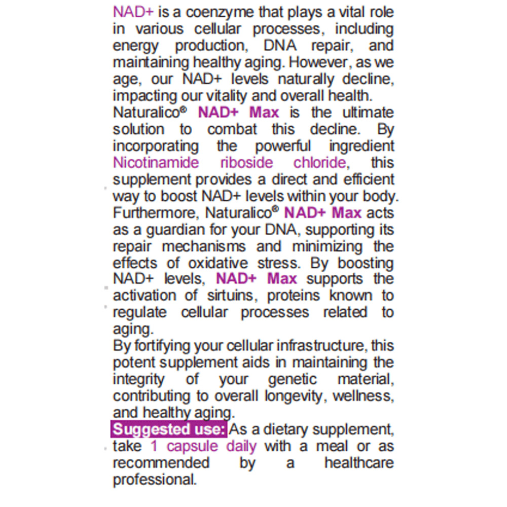 NAD+ е коензим, който играе жизненоважна роля в различни клетъчни процеси, включително производството на енергия, възстановяването на ДНК, както и на здравословното остаряване. С напредване на възрастта нивата на NAD+ в тялото естествено намаляват, което оказва влияние върху нашата жизненост и цялостно здраве. Naturalico NAD+ Max е най-доброто решение за борба с този спад. Чрез мощната си съставка никотинамид рибозид, тази добавка осигурява директен и ефикасен начин за повишаване на нивата на NAD+ в тялото ви. Освен това Naturalico NAD+ Max предпазва ДНК, като насърчава механизмите на възстановяване и минимизира ефектите от оксидативния стрес. Повишавайки нивата на NAD+, този продукт подпомага активирането на сиртуините, протеини, за които е известно, че регулират клетъчните процеси, свързани със стареенето.