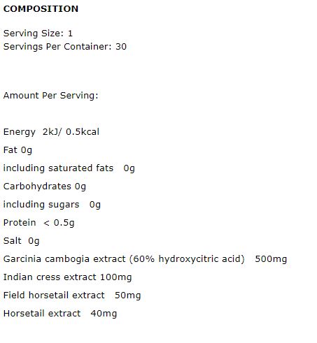 Съставки: настурция, корен от хрян, гарциния камбоджа, полски хвощ