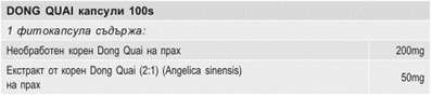 Dong Quai e продукт на билкова основа от марката Solgar, стимулира женската репродуктивна система, успокоява нервите, подпомага кръвообращението и засилва кръвта. Помага в случаи на предменструално напрежение, нередовна менструация и аменорея и облекчава симптомите на менопаузата.