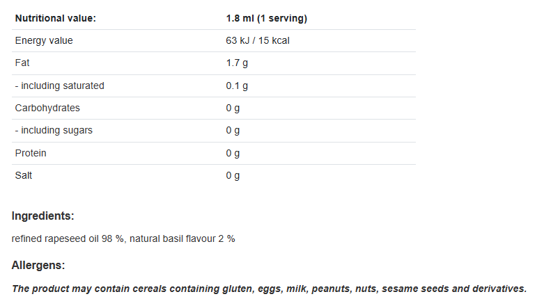 Това го прави идеален за пържене, печене и гриловане на месо, зеленчуци, омлети и други ястия, които обикновено изискват мазнина, за да не залепват. Специалният аромат на босилек придава леко свежо ухание и вкус, което може да подобри гурме усещането на готовите ястия. Продуктът е подходящ за хора, които следят калориите си, водят активен и здравословен начин на живот или искат да контролират приема на мазнини по време на готвене. Формата на спрея позволява прецизно дозиране, което намалява излишното използване на мазнини и подпомага приготвянето на по‑леки и вкусни ястия. Начин на употреба: Разклатете добре и пръснете около 1,8 ml от спрея върху незагрята повърхност на тиган, скара или тавичка преди готвене.