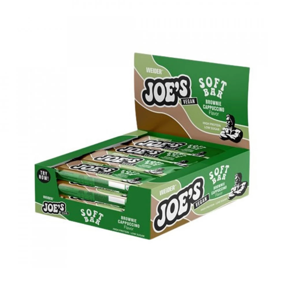 Новите протеинови барове са наистина специални, затова решихме да ги кръстим на основателя на нашата компания, г-н Джо Уайдър. Освен че се характеризират с перфектните си хранителни стойности, нашият Joe's Този блок е покрит със слой крем карамел и покрит с фин млечен шоколад. Joe's Soft Bar Cookie-Dough Peanut съдържа 10% истински фъстъчен чипс за уникален вкус, докато Joe's Soft Bar Brownie Cappuccino съдържа автентични, хрупкави парчета бадеми, гарнирани с вкусен веган топинг. Протеиновото ядро е невероятно меко и се състои от веган протеинова матрица, която съчетава соя, пшеница, грах и семена тиква. Барът съдържа автентични хрупкави бадемови парчета и е покрит с вкусно веганско покритие. С 29% протеин, вкусният Joe's Vegan Soft Bar Brownie Cappuccino е идеален за всеки физически активен или спортист, допринасящ за поддържането и растежа на мускулната маса. Освен това всяко блокче съдържа само 195 калории и 1,4 г захар. Нашата мисия в WEIDER е да предоставим на нашите клиенти най-доброто спортно хранене, за да могат да водят здравословен и постигнете спортните си цели. С над 85 години опит в тази индустрия, ние осъзнахме важността да използваме съставки с най-високо качество и доверие във всички наши продукти.- Нов невероятно мек протеинов блок - 100% веган!